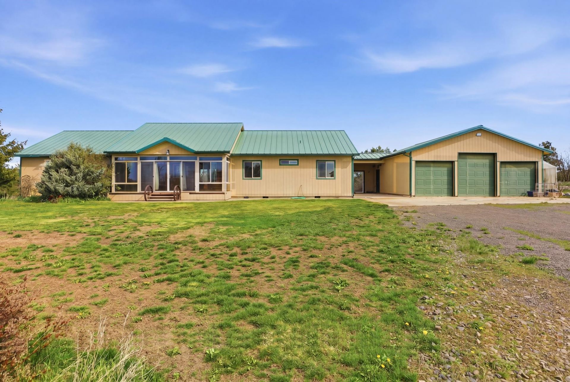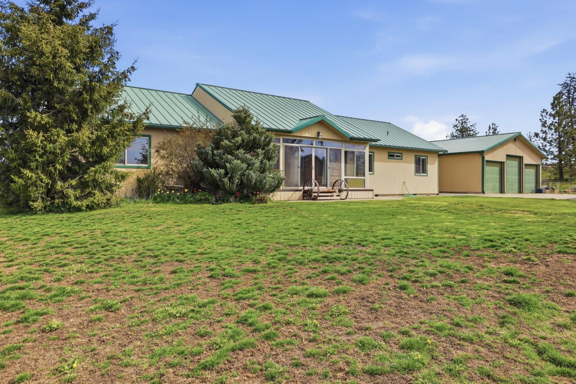 Very open concept with soaring cathedral ceilings. Beautiful wood floors, Nicely appointed granite counter kitchen with propane gas range top plus pantry. Spacious primary suite with large walk in closet-jet tub + separate shower. Large sunroom/plant room. Main floor laundry with wash tub sink-cabinets and counter. Cozy propane gas fireplace. Oversized 3 car garage plus an additional stick-built 28X32 garage/shop (gravel floor) with two 9 foot tall doors. Lots of gardening area, pasture for animals. Just minutes to Spokane, the airport, etc. Nice greenhouse plus potting shed. No carpeting/no finish flooring in the bedrooms. Property is being sold AS IS. Read Form 17 before viewing home- -ask your Realtor for a copy.